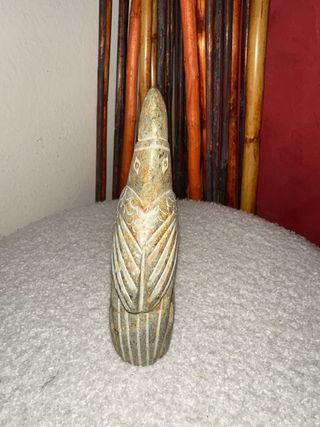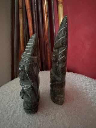 Set di due statuine in pietra provenienti dal Sud America. Raffigurano figure stilizzate con dettagli incisi. - Materiale: Pietra - Provenienza: Sud America - Quantità: 2 pezzi