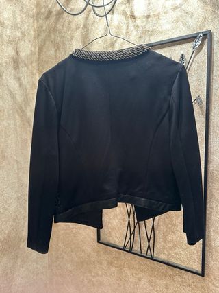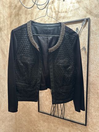 Elegante giacchino in ecopelle con un raffinato bordo decorato. - Dettaglio a catena sul collo. - Inserti in pizzo. - Tasche applicate sul davanti. Difetto spellatura interno causa appendino (indossata non si nota )
