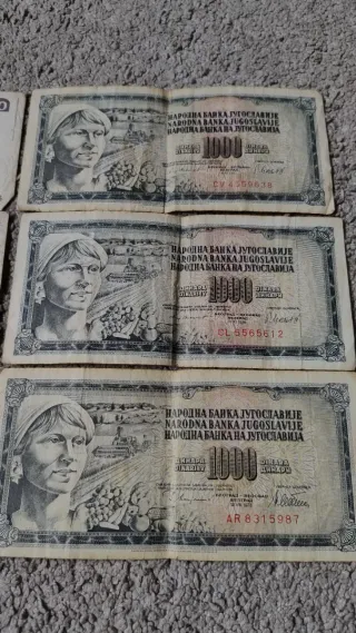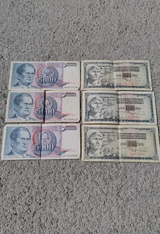 Tre banconote da 5000 Dinari della Jugoslavia. - Banconota con ritratto di Josip Broz Tito. - Banconota con ritratto di donna. - Valore nominale: 5000 Dinari.