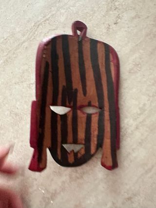 Maschera decorativa in legno di origine africana, ideale da appendere. - Realizzata in legno intagliato. - Dettagli dipinti in nero, rosso e marrone. - Motivi tribali e geometrici. - Finitura artigianale.