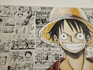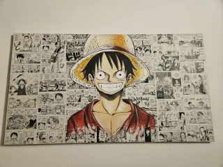 Bellissimo quadro decorativo ispirato a One Piece, perfetto per gli appassionati. Quadro dipinto a mano su tela 50x70 cm. Sfondo fogli fumetto one piece e al centro il personaggio dipinto con colori acrilici.