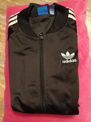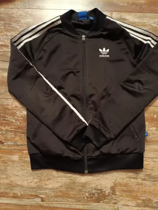 Giacca sportiva Adidas con zip frontale e dettagli a contrasto. Dettagli difetti in foto senza precluderne l'utilizzo. - Maniche con le classiche tre strisce. - Logo Adidas sul petto. - Collo alto a costine.