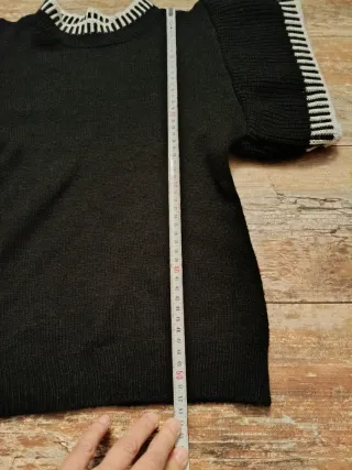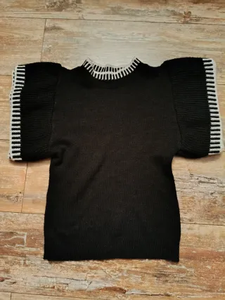 Elegante maglione con un design unico. Taglia S/M - Maniche a sbuffo con dettagli a righe. - Collo a costine a righe. - Tessuto morbido e confortevole.