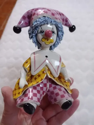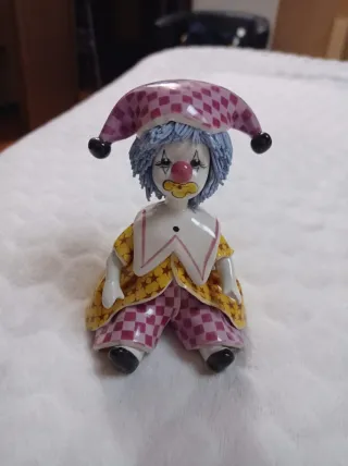 Statua di un clown Zampiva in ceramica. Presenta un cappello a scacchi rosa e viola, capelli blu e un vestito colorato. - Dettagli dipinti a mano. - Finitura lucida.