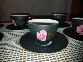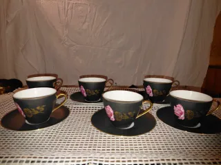 Elegante set di sei tazze da tè con piattini, perfette per ogni occasione. Il design presenta delicate rose rosa su sfondo nero, con dettagli dorati che aggiungono un tocco di raffinatezza. - Sei tazze da tè - Sei piattini abbinati - Decorazione con rose e dettagli dorati