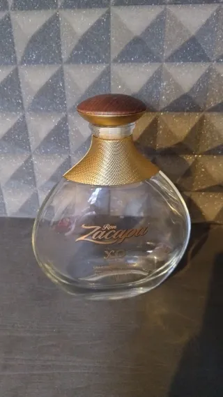 Bottiglia vuota portafiori Zacapa XO. - Design elegante e distintivo. - Tappo in sughero e pelle marrone. - Collo dorato testurizzato.