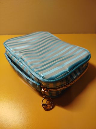 Piccolo beauty-case Carpisa con un design a righe bianche e azzurre in plastica, mai usato. - Fantasia a righe azzurre e bianche. - Dettagli dorati, inclusa la zip e il ciondolo. - Manico laterale per un facile trasporto.