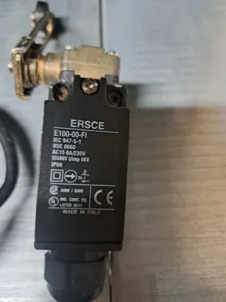 Finecorsa ERSCE modello E100-00-FI. - Certificazione IEC 947-5-1. - VDE 0660. - AC15 6A/230V. - Ui500V Uimp 6KV. - Grado di protezione IP66. - A300/Q300. - IND. CONT. EQ. LISTED 6811. - Made in Italy.