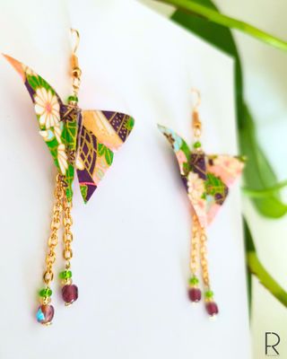 Vendo n. 1 paio di orecchini pendenti origami fatti a mano Soggetto: Farfalla Colore: fantasia floreale multicolore (viola, verde, rosa, azzurro, oro, panna ecc.) Creati con: carta giapponese washi verniciata, strass, catenella e ganci dorati (monachelle) Dimensioni singolo orecchino: - lunghezza 7,5 cm ca. gancio compreso - larghezza 4 cm ca. - peso 1,20 gr ca. Condizioni: il prodotto è nuovo e non è mai stato indossato. Perfetto come regalo per lei di Compleanno, San Valentino, Festa della Mamma e Natale.