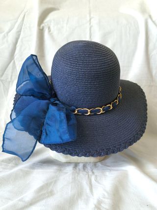 Vendo n. 1 cappello di paglia a tesa larga con nastro, catena dorata e fiocco da donna. Colore: blu Taglia: 57 Diametro 37 cm Condizioni: il prodotto è stato usato pochissimo ed è in ottime condizioni.