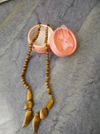 Collana girocollo realizzata con pietre naturali occhio di tigre. Un accessorio unico che aggiunge un tocco di eleganza. Lunghezza 47 cm - Pietre sfaccettate e a forma di goccia. - Chiusura a moschettone.