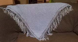 Elegante scialle realizzato all'uncinetto con un motivo a foglie e frange decorative. Un accessorio unico che aggiunge un tocco di stile. - Lavorazione artigianale all'uncinetto. - Design a forma triangolare. - Bordi rifiniti con frange. - Motivo decorativo a foglie ripetuto.