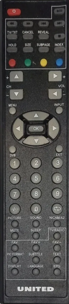 Telecomando originale UNITED per TV. - Tasti numerici da 0 a 9. - Tasti funzione: MENU, INPUT, EXIT, DVB. - Tasti di navigazione e OK. - Tasti per canali e volume. - per i modelli LED16X13 LED16X12 LED19X10 LED19X11 LED19X18 LED22X10 LED22X11 LED22X13 LED22X18 LED24X10 LED28W13 LED32X11 LED32X13 LED32X18 LTW22X94DB