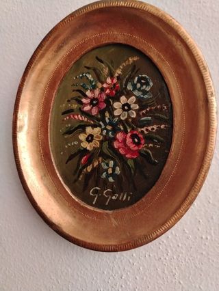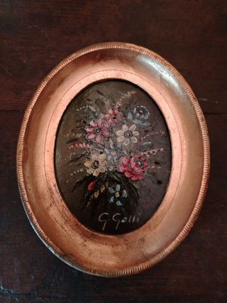 Quadretto con dipinto floreale,cornice lignea,dorata e ovale,misure:17,50x13,50 cm,in ottime condizioni.Molto bello. Prezzo fisso