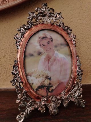 Portafoto vintage,cornice in metallo lavorato e perline,vetro protettivo,misure:13x19 cm circa,in ottime condizioni.Bello! Prezzo fisso