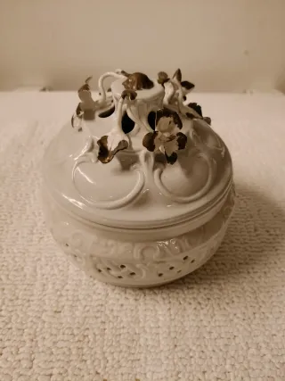 Elegante centro tavola in ceramica, con una raffinata decorazione floreale. - Dettagli in oro e bianco. - Design ricercato.