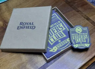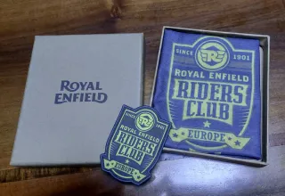 Moto e motociclisti. Set Royal Enfield Riders Club Europe con patch e foulard. Nuovo, nella scatola originale.