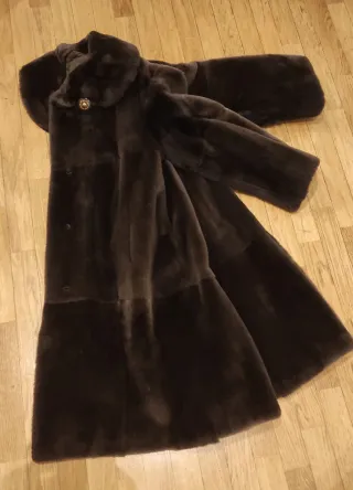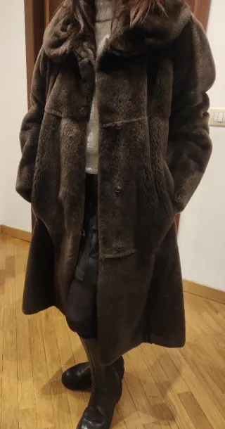Elegante pelliccia di castoro rasato , colore marrone , vestibilità S/M , con tasche . Caldissima , come nuova usata pochissimo . Lunghezza cm 100 Fattura artigianale , eseguita da una storica pellicceria milanese .