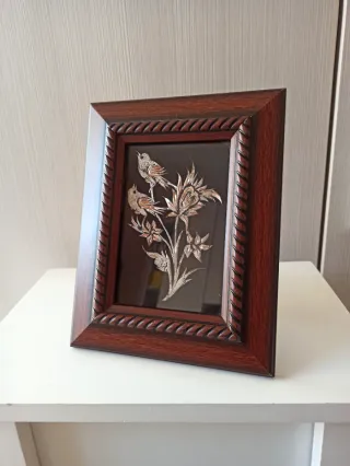 Quadro artigianale mediorientale raffigurante motivo floreale e due uccelli realizzati con lamine di metallo applicate su sfondo scuro. Cornice effetto legno. Misure: 15x19 cm.