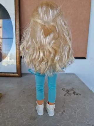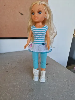 Bambola Nancy con vestito a righe e pantaloni. - Vestito a righe bianche e azzurre. - Gonna a pois bianchi con fiori. - Pantaloni azzurri. - Stivali bianchi. - alta cm 40 - molto bella