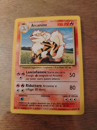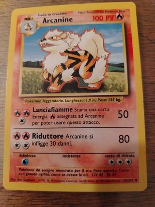 Carta Pokémon di Arcanine, Fase 1, con 100 PV. - Attacco Lanciafiamme: Scarta una carta Energia assegnata ad Arcanine per poter usare questo attacco. - Attacco Riduttore: Arcanine infligge 30 danni. - Debolezza: Acqua - Resistenza: Fuoco - Costo di ritirata: 3 Energie - Illustrazione di Ken Sugimori. - Numero carta: 23/102. -Nuova