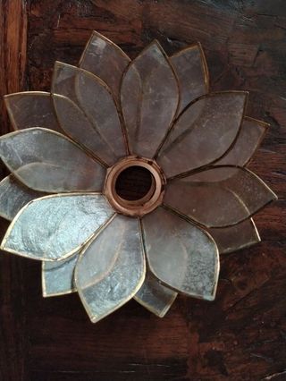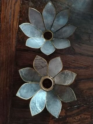 Due paralumi in madreperla e ottone (ultima coppia di trentaquattro),apertura massima 15,50 cm,diametro foro superiore 2,8 cm circa,in ottime condizioni. Molto belli. Prezzo fisso.