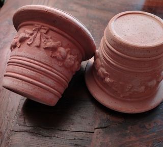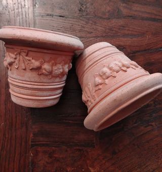 Coppia di vasi in cotto decorati con motivi floreali,nuovi e mai utilizzati,misure:diametro superiore 13 cm,diametro base 7,50 cm,altezza 11 cm.Molto carini. (Disponibili,su richiesta altri due). Prezzo fisso.