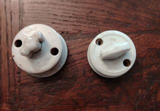Due interruttori in ceramica ,anni '30-'40,in buone condizioni (penso comunque che siano da utilizzarsi a scopo decorativo,o forse anche per altro..). Articoli rari. Prezzo fisso.