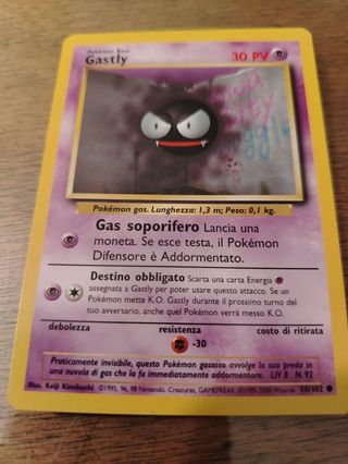 Carta Pokémon Base di Gastly. - PV: 30 - Attacco: Gas soporifero - Attacco: Destino obbligato - Debolezza - Resistenza: -30 - Livello: 8 - Numero: 92 - Illustratore: Keiji Kinebuchi