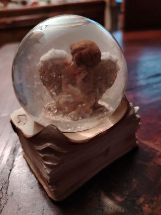 Palla di vetro con neve e angioletto,vintage,base in resina a forma di libro,9 cm di altezza complessiva e 6,5 cm di diametro,in ottime condizioni. Prezzo fisso.