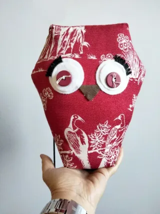 Un simpatico gufo decorativo, perfetto per tenere ferme le porte oppure da usare come oggetto decorativo per la casa, o per collezionisti di gufi! Realizzato a mano, in tessuto rosso e bianco con un vivace motivo. - Motivo con uccelli e fiori bianchi su sfondo rosso. - Dettagli degli occhi con bottoni rossi e ciglia nere.