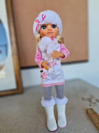 Bambola Nancy con abbigliamento invernale. - Cappello bianco in pelliccia sintetica con fiocco rosa. - Sciarpa abbinata. - Gilet bianco con dettagli rosa. - Pantaloni grigi. - Stivali bianchi con pelliccia sintetica.