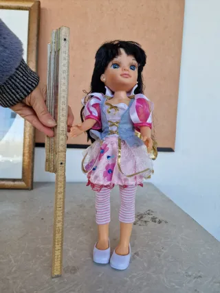 Bambola Nancy con vestito colorato. - Vestito rosa con fiori e dettagli dorati. - Maniche a sbuffo. - Calzini a righe rosa e bianche. - Scarpe bianche.