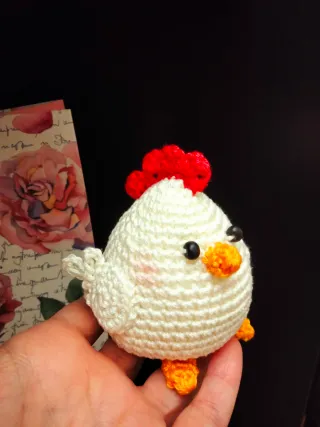 Adorabile pollo amigurumi realizzato a mano all'uncinetto. Perfetto come decorazione o idea regalo. Colore panna, becco e zampe arancioni e cresta rossa.