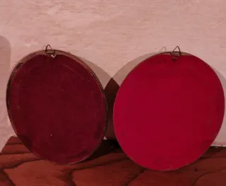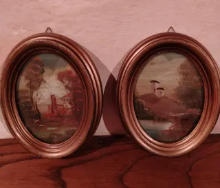 Due quadretti gemelli, vintage, paesaggi dipinti, cornici ovali, lingnee e dorate, completi di vetro,in ottime condizioni, misure:15x12cm. Molto interessanti. Prezzo fisso.