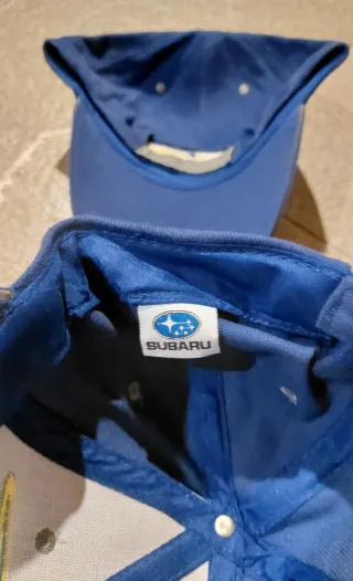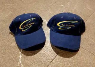 Set di due cappellini originali Subaru, ideali per gli appassionati di rally. Colore blu scuro con logo Subaru ricamato in giallo. In cotone, misura unica regolabile. Nuovi.