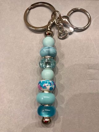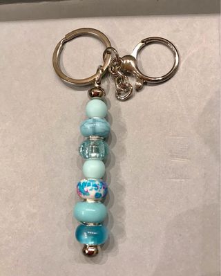 Portachiavi artigianale realizzato con una selezione di perline sui toni dell’azzurro. - Perline di varie forme e finiture. - Elementi metallici lucidi. - Moschettone per un facile aggancio.