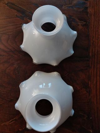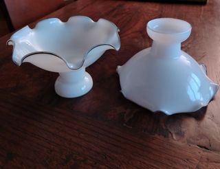 Coppia di opaline gemelle,vintage,color bianco-latte con bordino grigio scuro ondulato,diametro pricipale:20,50 cm,diametro foro superiore:7,70 cm circa,in perfette condizioni. Vendibili,su richiesta,anche singolarmente. Molto interessanti. Prezzo fisso.