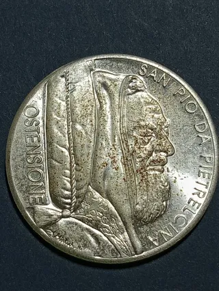 Medaglia commemorativa raffigurante San Pio da Pietrelcina.medaglia argentata. - Dritto: San Pio da Pietrelcina con iscrizione SAN PIO DA PIETRELCINA OSTENSIONE. - Rovescio: Non visibile nell'immagine.