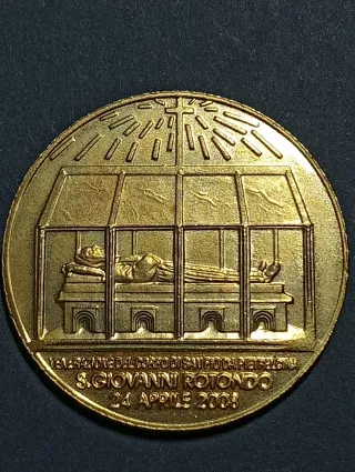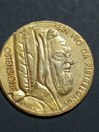 Medaglia commemorativa di San Pio da Pietrelcina,dorata - Raffigurazione di San Pio da Pietrelcina. - Scritta SAN PIO DA PIETRELCINA sul bordo. - Scritta OSTENSIONE sul bordo. - Firma dell'artista A. Montinelli in basso a sinistra.