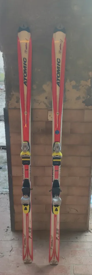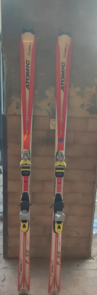 Coppia di sci Atomic con attacchi. - Sci da discesa. - Design rosso e bianco.