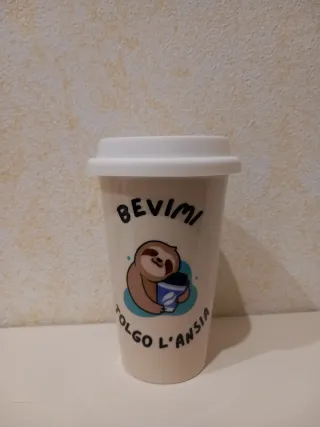 Tazza in ceramica con un simpatico disegno di un bradipo che tiene una tazza di caffè. La scritta Bevimi e Tolgo l'ansia la rendono un pezzo unico. Con tappo in silicone Tiene più a lungo al caldo la bevanda