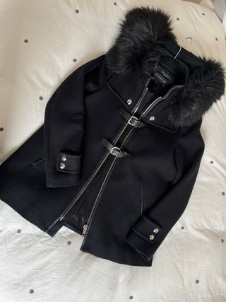 Cappotto Zara da donna, taglia XS, dal design leggermente a trapezio (più ampia verso il fondo) super femminile e comodo, perfetto per valorizzare la figura senza segnare. Dotato di cappuccio con pelo nero morbidissimo, soffice al tatto e dall’effetto super chic, ideale per affrontare l’inverno con stile. Il cappotto ha una chiusura con zip centrale arricchita da cinture decorative con fibbia, che aggiungono carattere e un tocco grintoso al capo. Presenti anche tasche laterali e dettagli sui polsini, che completano il look rendendolo curato in ogni particolare. Un cappotto caldo, moderno e super alla moda, facile da abbinare!
