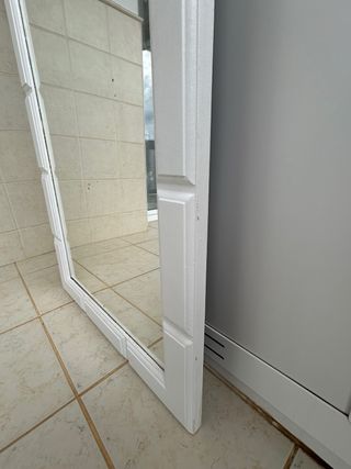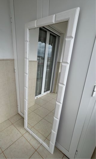 Espejo de madera maciza para vestidor o entrada Pintado en color blanco Tiene algunas manchas de desgaste Medidas: 62 cm ancho x 162 cm alto