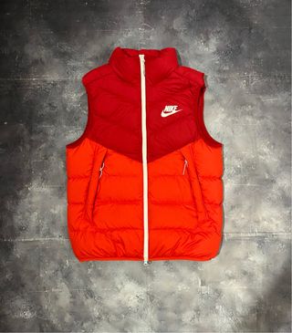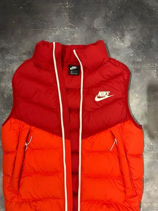 Gilet imbottito Nike da uomo, perfetto per un look sportivo. - Design bicolore con pannelli rossi e arancioni. - Logo Nike sul petto. - Zip centrale.