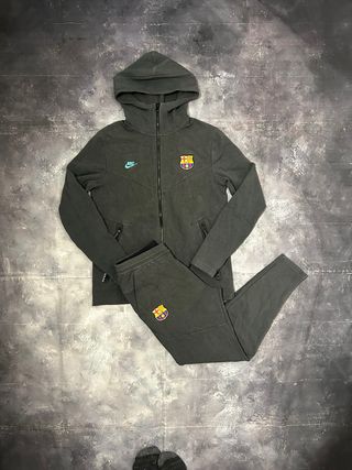 Completo Nike Tech FC Barcelona vintage, un conjunto deportivo con estilo. - Logo del FC Barcelona. - Logo de Nike. - Color verde oliva.