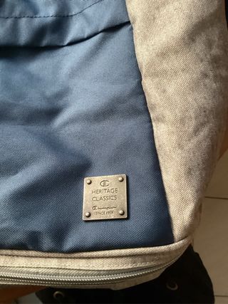 Zaino Champion con etichetta Heritage Classics Since 1919. Realizzato in tessuto resistente. - Patch in metallo con logo Champion. - Combinazione di colori blu e beige.