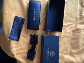 Occhiali da sole Versace neri, completi di custodia e panno per la pulizia. - Custodia rigida con logo Versace. - Panno in microfibra per la pulizia delle lenti. - Scatola originale Versace.