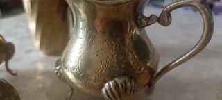 Elegante servizio da tavola in metallo, ideale per aggiungere un tocco di classe alla tua tavola. - Set composto da zuccheriera, lattiera e due saliere. - Finitura in metallo dorato. - Decorazioni floreali incise.