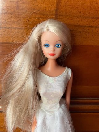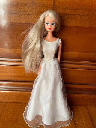 Bambola Barbie con un elegante abito da sposa bianco. - Abito lungo con dettagli scintillanti. - Tessuto in raso e tulle. - Orlo con finitura argentata.